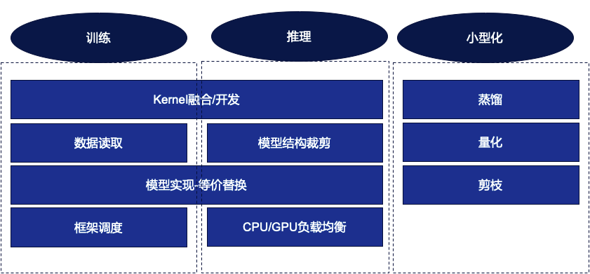 模型优化工作分为三个方面:训练、推理和小型化。