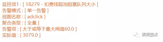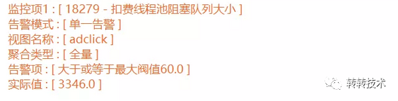 起初,我们收到了线上的告警通知:扣费服务的线程池任务队列大小远远超出了报警设定的阈值,而且队列大小随着时间推移还在持续变大。详细告警内容如下:
