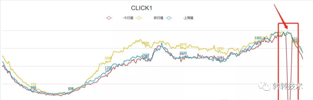 相应的,广告业务指标:点击数、收入等也出现了非常明显的下滑,几乎同时发出了业务告警通知。其中,点击数指标对应的曲线表现如下:
