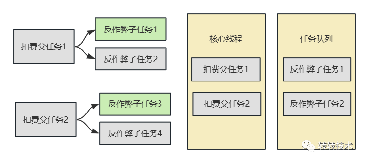 一次扣费行为被视为父任务,其中包含多个子任务,这些子任务用于执行反作弊策略。假设线程池的核心线程数为2,目前正在执行扣费父任务1和2。此外,反作弊子任务1和3已完成执行,而反作弊子任务2和4仍在任务队列中等待调度。