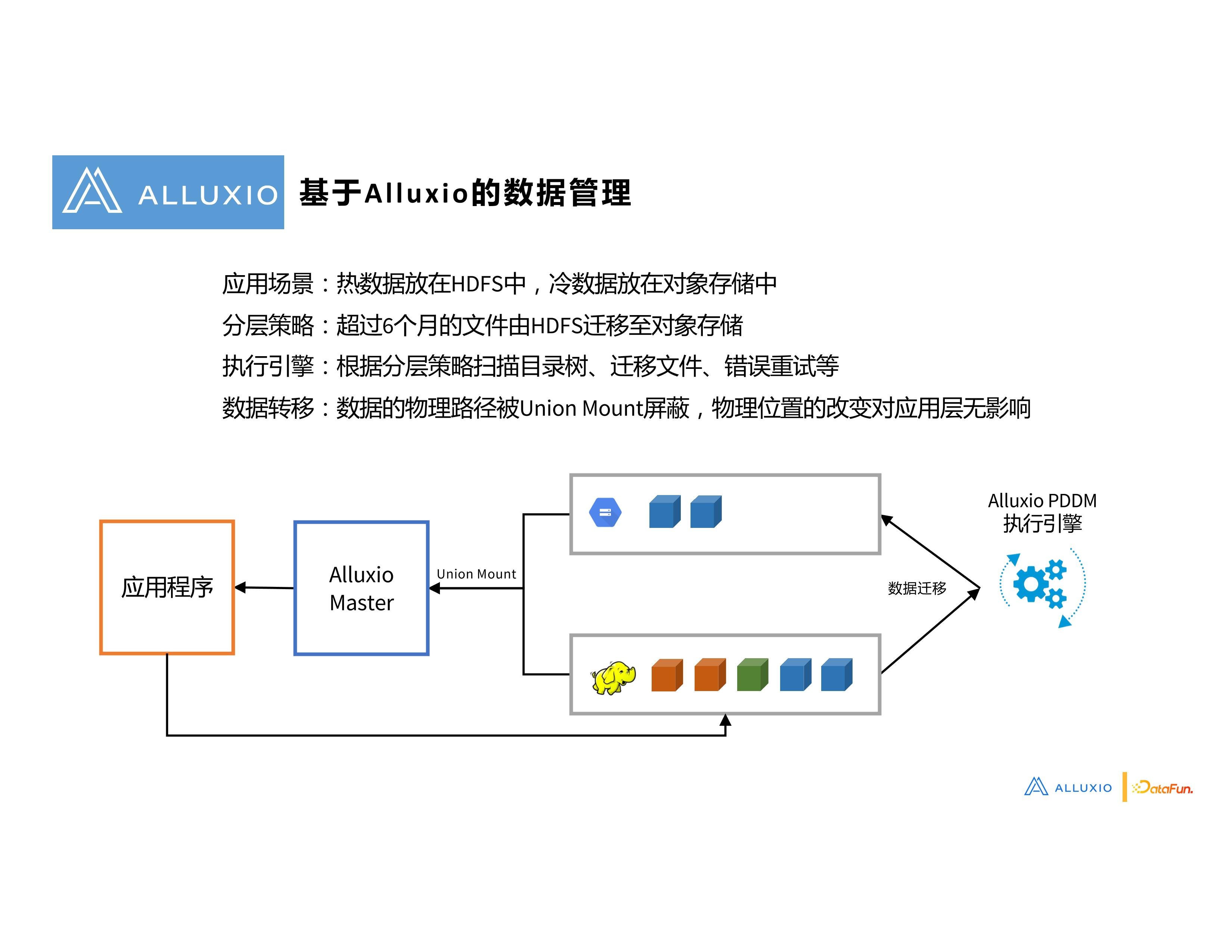 结合前面提到的 union mount 挂载:因为数据从 HDFS 挪到了对象存储里边,物理位置发生了变化,但是由于两个存储的数据的挂载点都挂载在 Alluxio 的同一个目录下面,因此用户应用程序如果通过 Alluxio 目录去访问数据的话,并不会感知到物理位置的变化,这样就完全避免了由于数据在混合存储下物理位置变化而带来的改造需求。Alluxio 数据管理,将 PDDM 执行引擎和 union mount 这两个功能配合使用,达到数据管理的目的,并且对应用是低侵入的。
