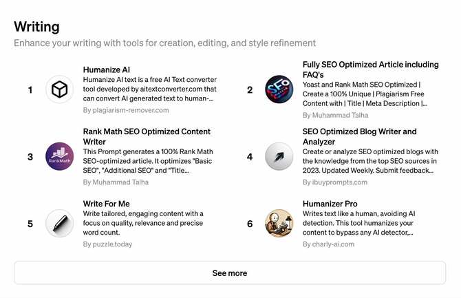 除此之外,根据应用的用途,GPTs还被划分为“写作”、“效率”、“研究和分析”、“编程”、“教育”和“生活方式”等类目。