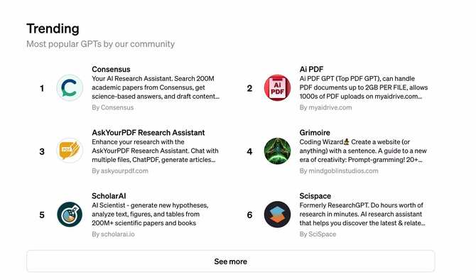 GPT store给笔者第一感觉就是:OpenAI正在打造AI行业的生态,但是这个生态很像苹果的App Store,也有很多分类,如,Featured:本周精选特色应用;Trending:社区最受欢迎的GPTs;By ChatGPT:由ChatGPT团队创建的GPTs;等等。