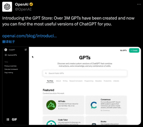 昨日凌晨,OpenAI官宣:GPT Store,正式上线!并表示:“来认识一下GPT Store~ 我们已经有超过300万个自定义版本的ChatGPT喽~”