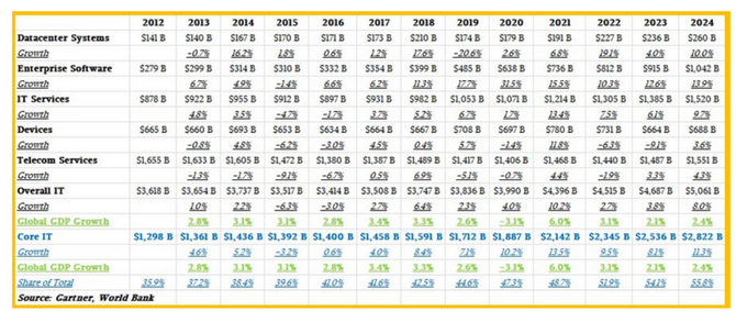 为了使这些数据更加有趣和相关,表2将核心IT收入(数据中心系统+企业软件+ IT服务)的增长与每年的全球国内生产总值(GDP)增长进行了比较。还计算了核心IT收入在IT总支出中所占的份额。