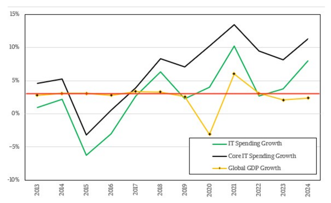 图1 2013~2024年全球GDP、核心IT支出和总体IT支出的增长