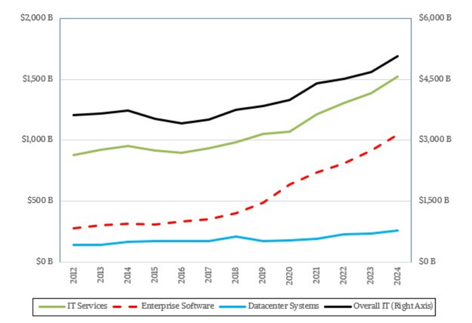 图2 2012~2024年全球IT支出的增长以及核心IT的三个部分的增长