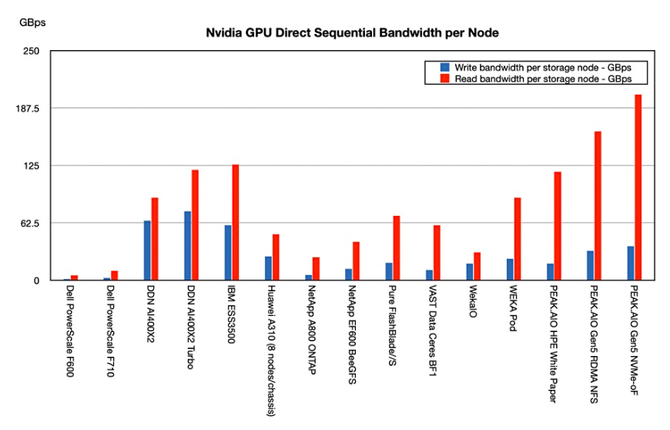 2月2日,迈克尔·戴尔曾发推文表示:“如果存储系统无法以足够快的速度向英伟达交付数据,那么英伟达GPU往往会陷入闲置。也正因为如此,我们才打造出了世界上最快的AI存储方案PowerScale。”但这条评论与GPUDirect厂商的统计数据不符,从统计结果来看,与DDN、华为、IBM、NetApp以及BeeGFS、VAST和WEKA的并行系统相比,当时还在采用按序IO设计的PowerScale明显处于落后地位。
