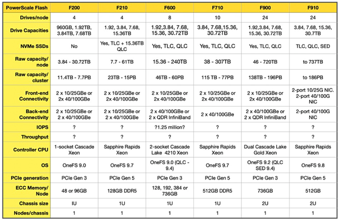 本次发布的F910与F900一样,采用2RU机箱并配有24个NVMe驱动器。每个节点最多可容纳1.87PB容量,意味着其采用的是61TB SSD,我们认为是由Solidigm提供的QLC驱动器。戴尔非结构化数据解决方案(UDS)部门高级产品经理Tom Wilson在F910博客中表示,“与之前发布的F710相比,F910每RU的密度提高了20%。”