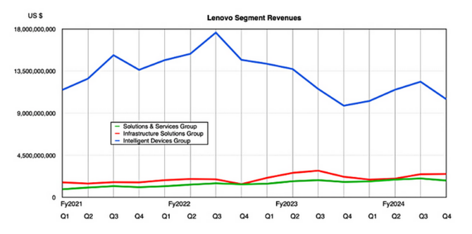 联想有三个主要业务部门:解决方案和服务集团(SSG),基础设施解决方案集团(ISG -服务器和存储)和智能设备集团(IDG -个人电脑和智能手机),这三个部门的收入均同比增长。