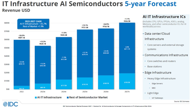 现在,让我们再来看IDC发布的AI半导体与AI服务器市场预测。该公司几周之前亮出了下面这张有趣的图表: