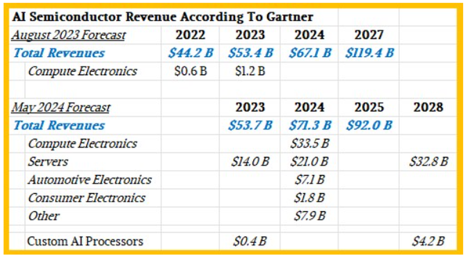 让我们先从Gartner开始。大约一年之前,Gartner曾经发布一份关于2022年AI半导体销售情况的市场研究报告,并预测了2023年及2027年的销售情况。几周前,Gartner又发布了一份修订之后的预测报告,对2023年进行了重新归纳,同时就2024年及2028年销售做出展望。第二报告的市场研究部分同样包含一些统计数据,我们将其添加到下表当中:
