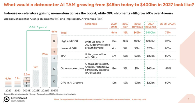 来自New Street Research的Pierre Ferragu团队在科技领域一直拥有出色表现,也曾尝试对这块价值4000亿美元的数据中心加速器蛋糕进行过细分,并在推特上发布了以下预测: