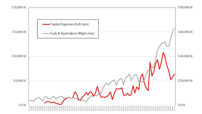 随着摩尔定律的放缓,芯片业务的难度和成本不断增加,盈利能力已成为一个挑战。从2005年至今,台积电平均能够将35%的收入转化为净利润,这是相当惊人的,而且在2021年下半年至2023年上半年期间,其平均净利润率更是高达41.6%。但自2023年下半年以来,盈利能力略有下降趋势,这也是为什么我们听到了台积电将提高其制造和封装服务价格的传闻——鉴于英伟达即使在2022年底生成式AI热潮兴起之前就能通过销售数据中心GPU获得丰厚的利润,这一举措也是合理的。