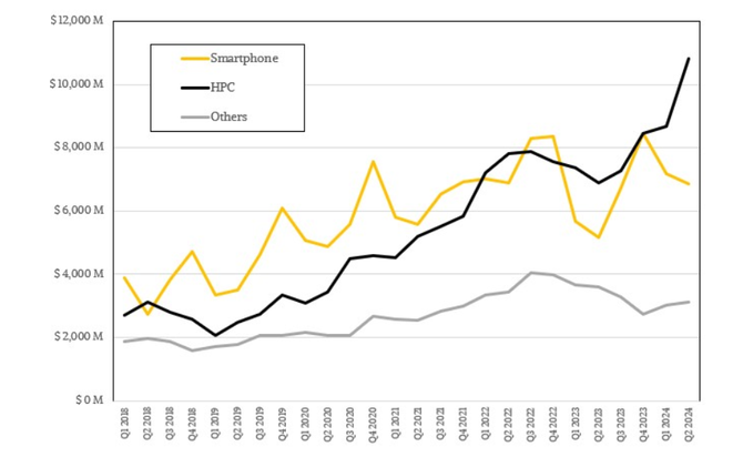 2023年,智能手机和PC业务一直处于低迷状态,这给台积电的产能规划带来了挑战,同时也对其利润产生了压力。在第二季度,台积电的智能手机业务同比增长32.8%,达到68.7亿美元,但环比下降了4.2%。在同一时期,按照台积电的定义,高性能计算(HPC)业务收入达到了108.3亿美元,比2023年第二季度增长了57%,环比增长了24.7%。这是HPC业务首次突破100亿美元的销售大关——但我们怀疑这不会是最后一次。