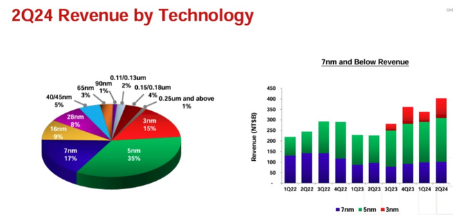 3纳米制程技术已经进入生产的第四个季度,从第一季度到第二季度,3纳米芯片的收入环比增长了83.9%,达到31.2亿美元。使用5纳米技术(包括N5系列及其N4半缩小版本)制造的芯片销售额为72.9亿美元,同比增长55%,环比增长仅4.4%。7纳米设备的销售似乎在一个季度前达到了顶峰,同比下降1.8%,环比下降1.3%,至35.4亿美元。使用较旧处理器和更大晶体管的芯片仍然占据了68.7亿美元的销售额,恰好是台积电2024年第二季度业务的三分之一。