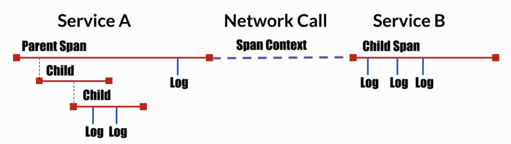 Span:Span代表追踪路径中的一个时间跨度,包括操作名称、开始时间、结束时间等信息,由SpanID作为标识。由多个 Span 可以形成一条追踪路径。Span还定义了父子、跟随两种关系。在Span上下文中,记录和维护了Trace的ID和当前Span的ID。