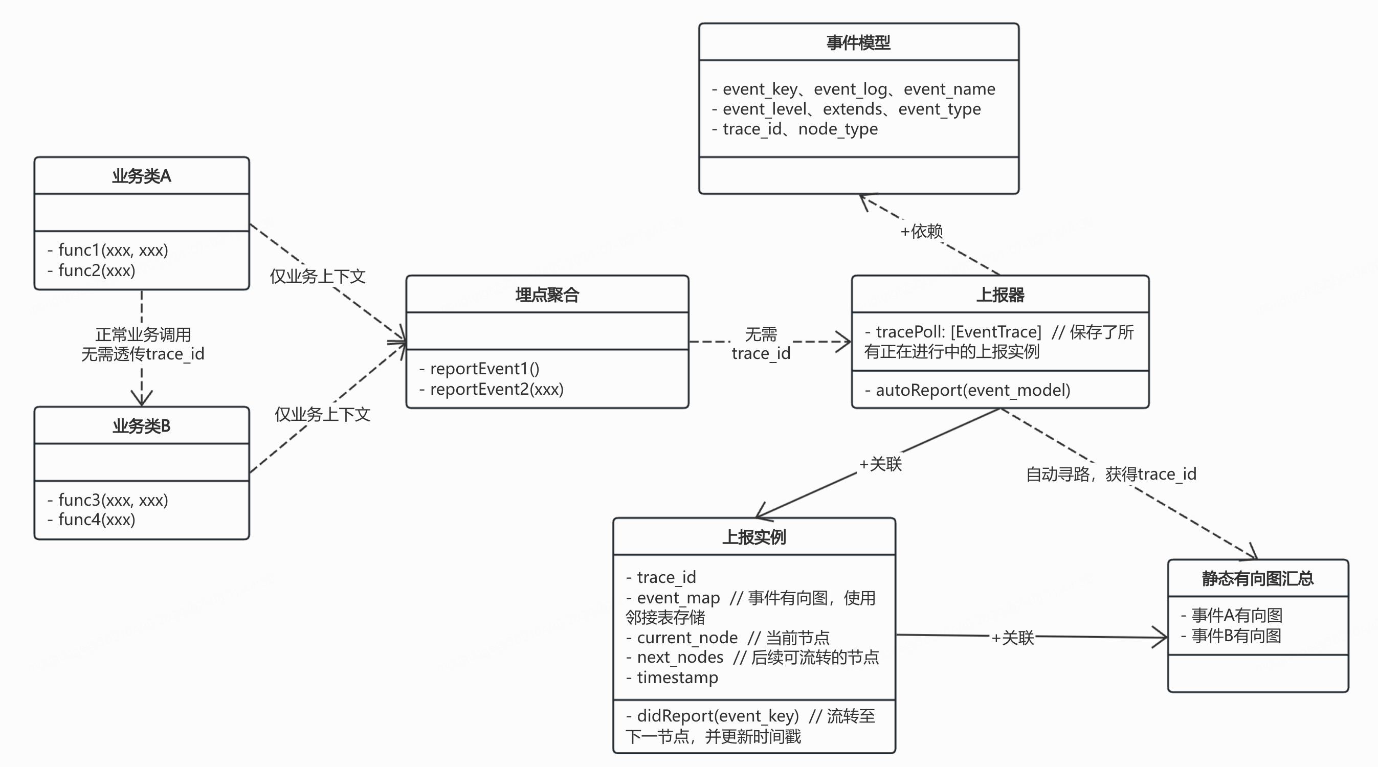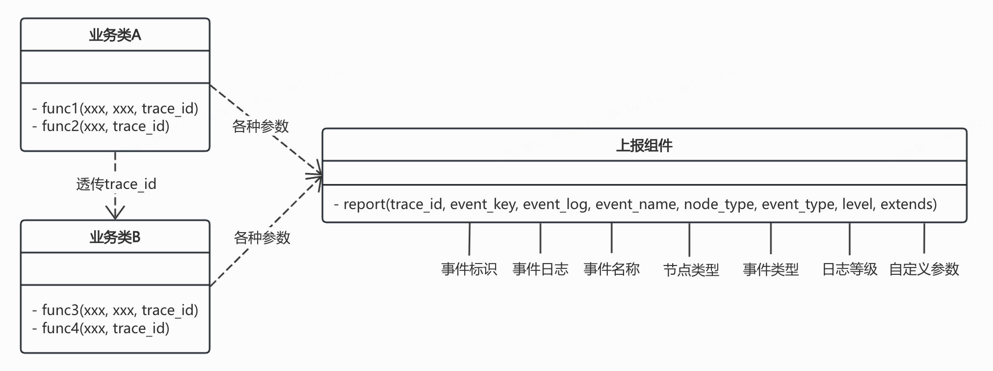 尽力减少上报方法传参的数量,将需要的参数都封装进一个事件模型类中,并针对起始节点提供便利构造方法。且将入参node_type、trace_id、level、extends字段加上默认值,这样对于大部分的节点,就不再需要携带所有的参数了。