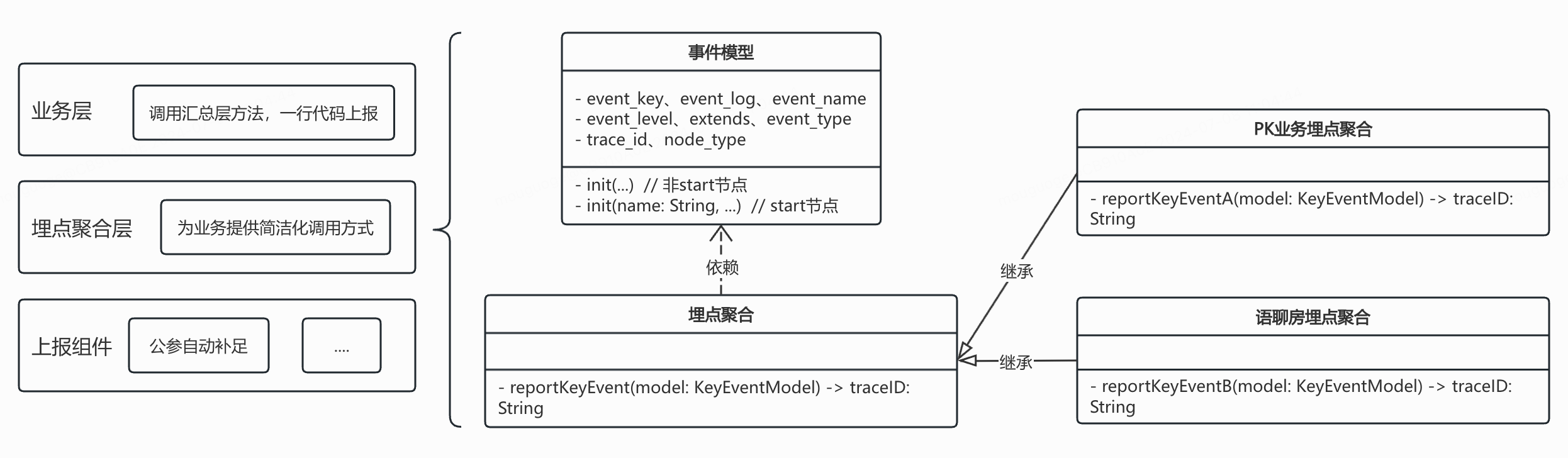 需要在业务层和上报层中间插入一个埋点聚合层,负责组装参数,并针对每一个节点向外提供一个简明的方法,在业务层就只需要一行简短的代码就可以完成上报了。