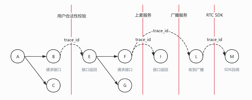 如果遵照上述的方案,B和E之间就会被错误的关联起来。为了规避这个问题,trace_id会在跨线程时从埋点组件中外抛,需要业务方短暂记录,并传递到下一个节点。当然,针对常用的网络请求,我们也做了易用的封装,详见2.3.1。