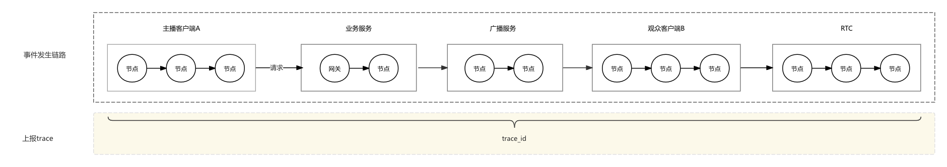 trace_id:一个复杂的事件链路往往并不是单端闭环的。拿邀请上麦举例,它涉及到主播客户端A -> 业务服务 -> 广播服务 -> 观众客户端B -> RTC。我们希望将这一次事件链路中相关的日志都能聚合起来呈现,而不是各端查各端的。为了解决这个问题,我们生成一个全链路都会透传的唯一ID,在每个端的上报中都会携带这个ID,然后通过这个ID,把这次事件关联的上报检索出来,一起展示。