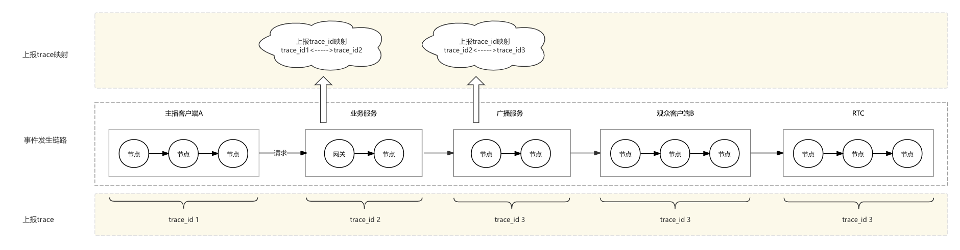 为兼容业务服务和广播服务各自独立的trace追踪系统,我们实现了一套多重映射算法,且无缝兼容了单trace_id方案,最终溯源成事件开始的原始trace_id。