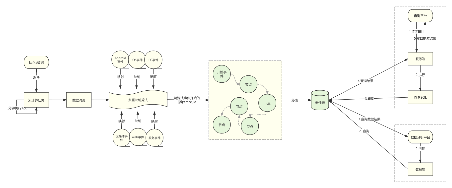 为应对直播的实时性要求,我们采用流计算技术。先快速筛选出trace相关事件,再清洗掉异常数据,在单次流计算执行过程中进行映射建立关系并落表存储,实现小于5min级别的数据响应处理。数据表支持灵活的定制化查询和分析需求。