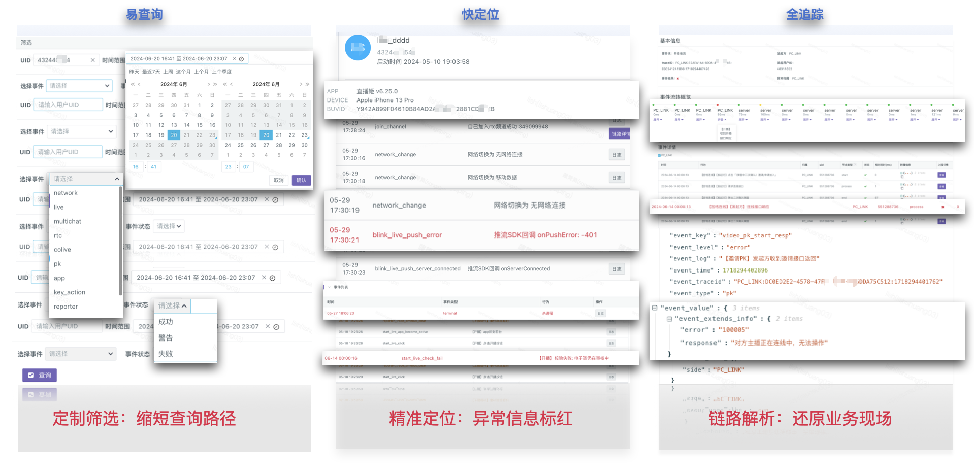 可视化简化了查询过程,能快速准确地捕捉异常和关键信息。适用于开发、测试、产品、运营、客服等角色。