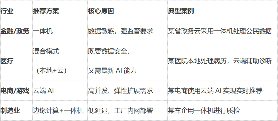 评估数据敏感性:如果涉及个人隐私、安全(如金融、政务),优先考虑一体机。如果数据可脱敏处理(如电商、游戏),云端AI更具成本优势。