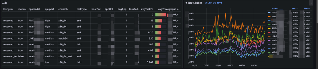 根据计算节点维度聚合的数据,以及节点上的标签进行再次实时聚合,绘制不同的维度的机型性能数据。如下:
