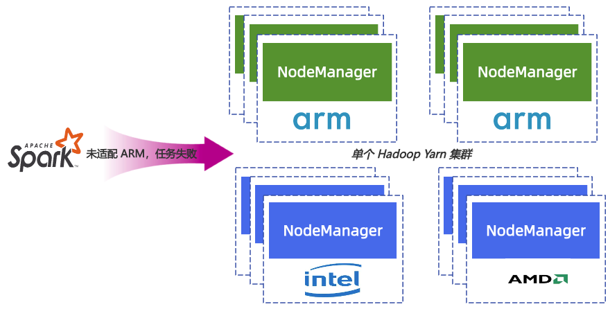 未适配 ARM 的 Jar 任务,统一在 YARN ResourceManager 侧通过黑名单避免调度到 ARM 计算节点上执行。对于这些任务,自动配置添加 constraint 为 nm.yarn.io/cpuarch=x86_64