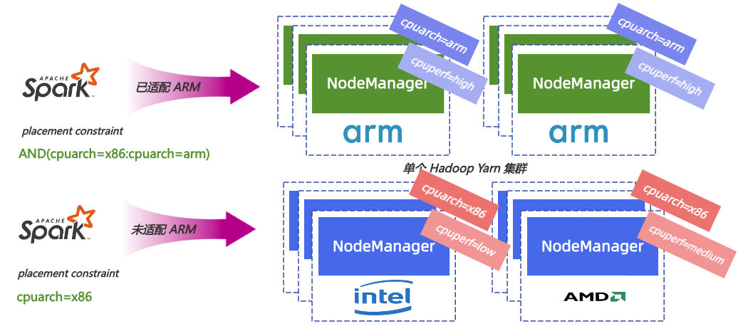 我们引入 YARN 节点属性 (YARN Node Attribute)调度功能,对不同节点加上不同的属性标签,并利用计算任务调度放置约束的设定 (YARN Placement Constraint),来实现指哪打哪的定向调度功能。