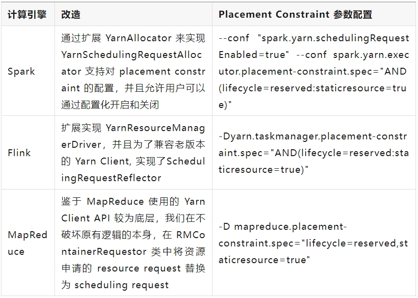 YARN Node Attribute 特性需要结合计算任务设定 task 放置约束 (YARN Placement Constraint) 来实现,但是各个计算引擎均未支持此功能,因此我们对 Flink、Spark、MapReduce 等计算引擎进行了改造适配(尚未贡献给开源社区)。