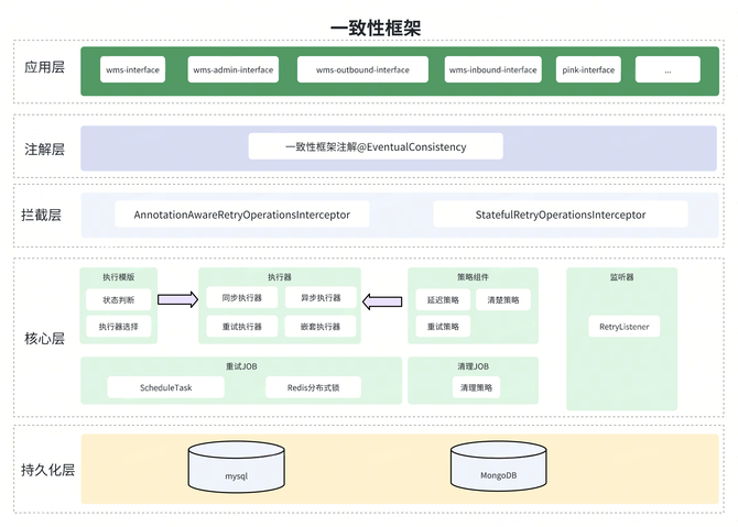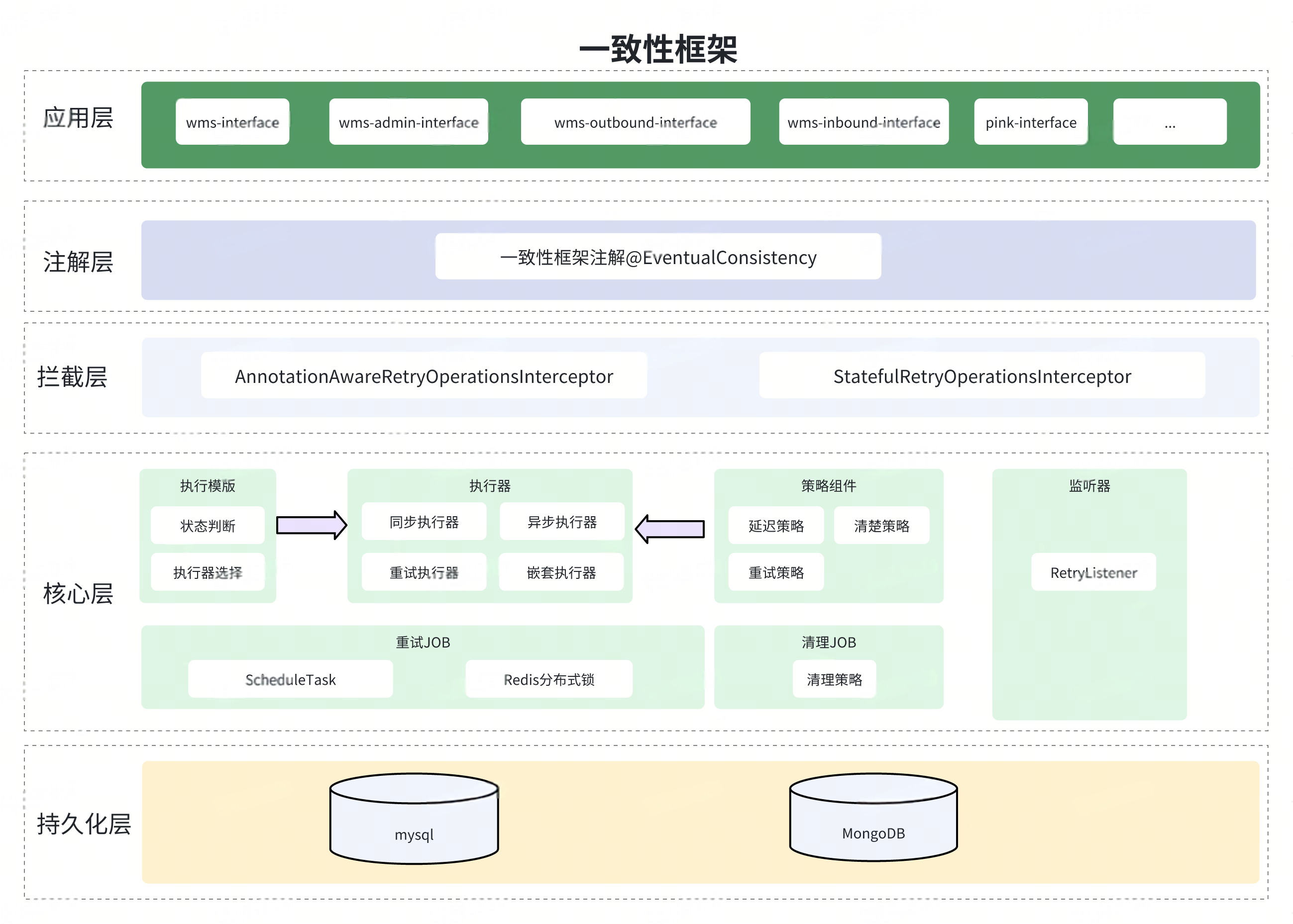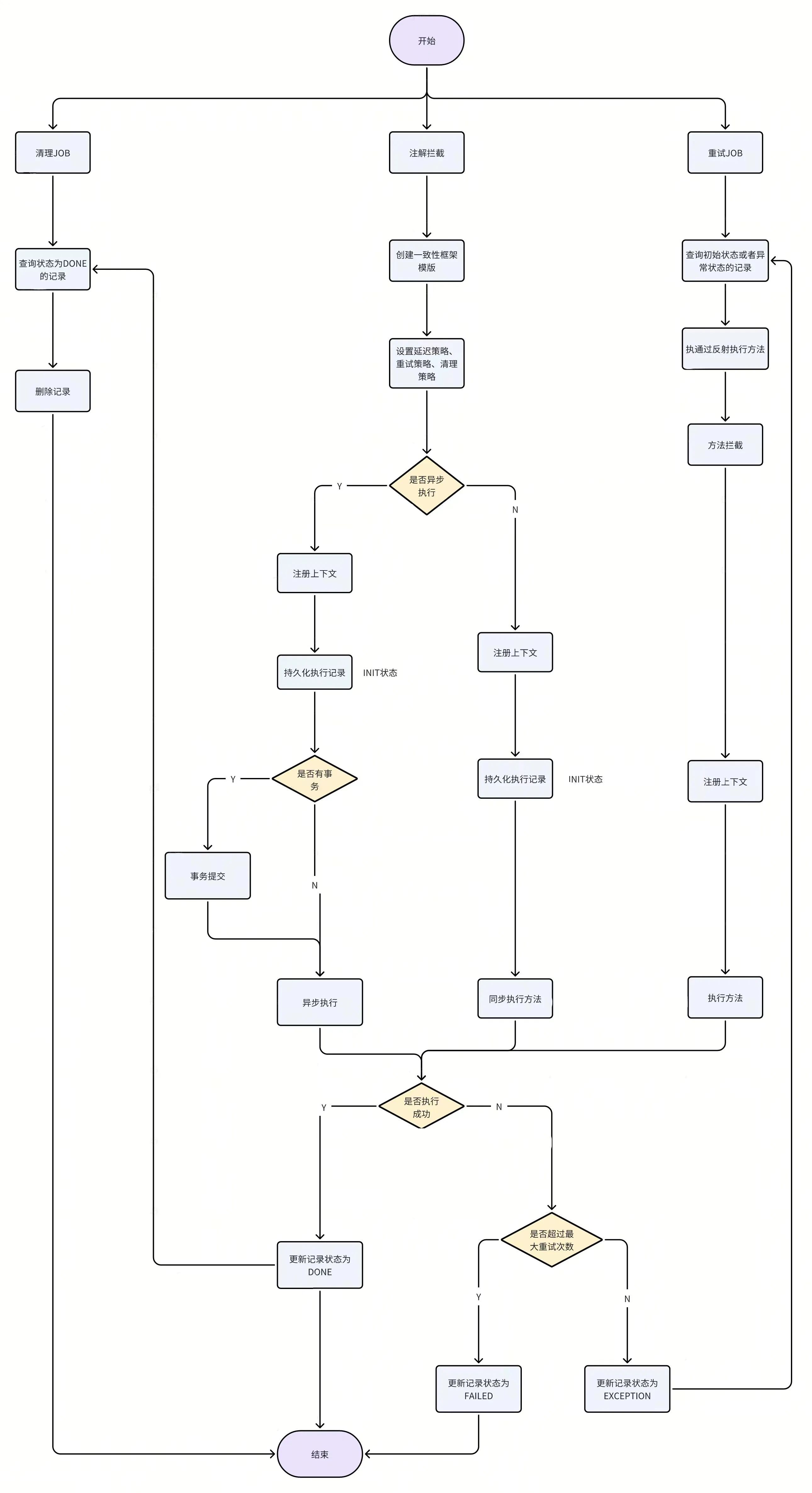 执行层负责根据当前带有一致性注解方法的状态来选择合适的执行器,执行带有一致性框架注解的方法。一致性框架会记录执行方法的状态,包含初始化、异常、失败和完成状态。