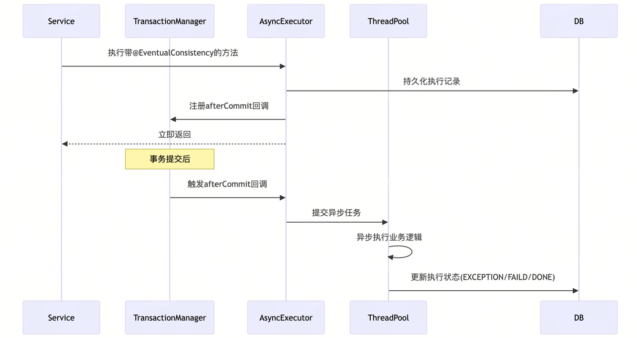 异步执行的核心是将操作持久化,然后在事务提交后异步执行。这种设计确保了只有当原事务提交成功后,才会执行异步操作,避免了事务回滚后执行异步操作的问题。