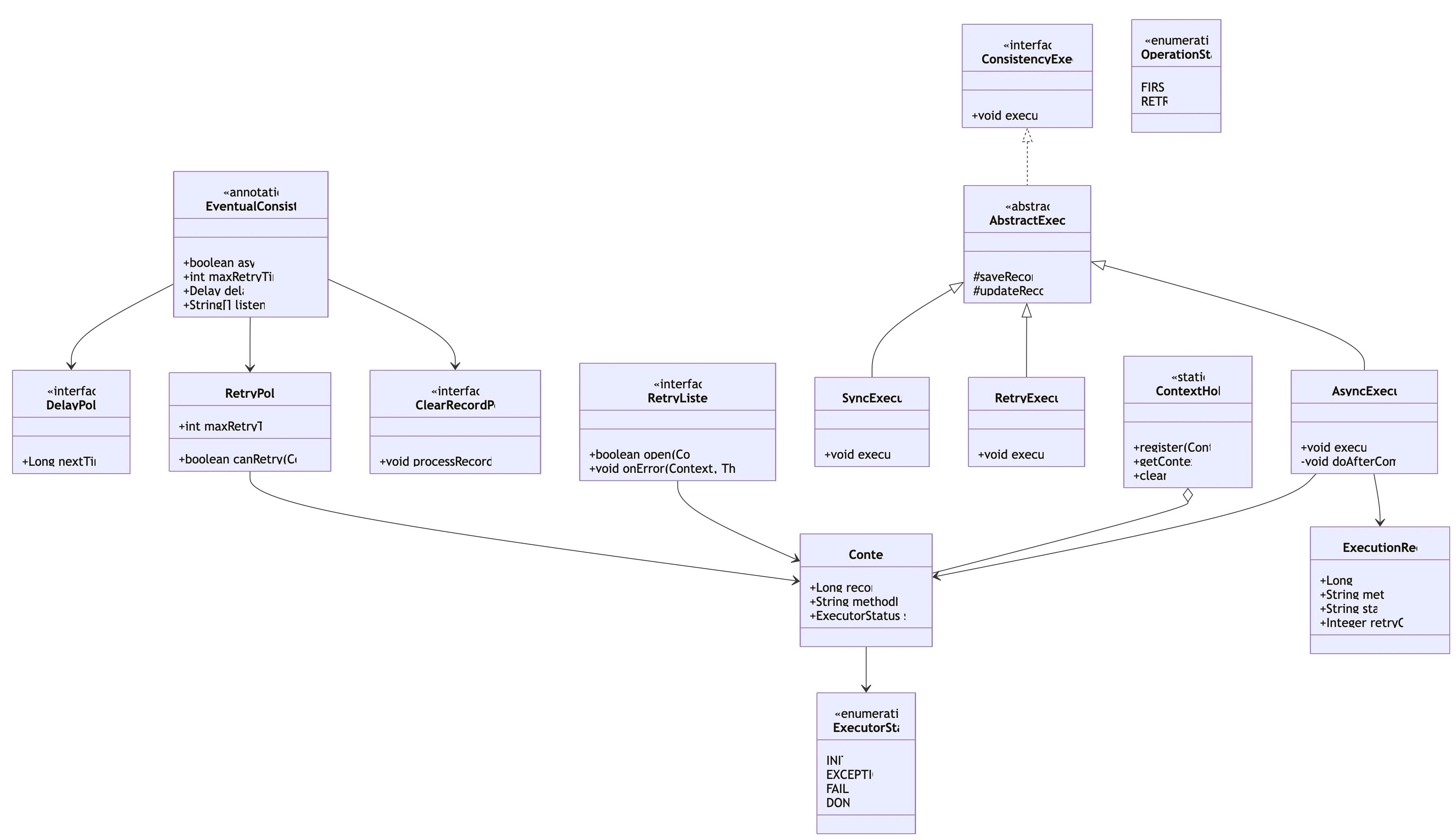 NestedConsistencyExecutor :嵌套执行器,专门处理嵌套一致性调用场景,记录执行信息但不立即执行方法,通过重试机制来执行嵌套任务,解决同一事务中嵌套调用的问题。