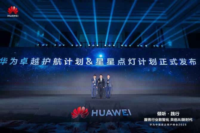 随后,华为企业交付与服务总裁李江华、华为中国政企业务副总裁何振、华为中国政企业务副总裁许超共同发布了“卓越护航&星星点灯计划”。
