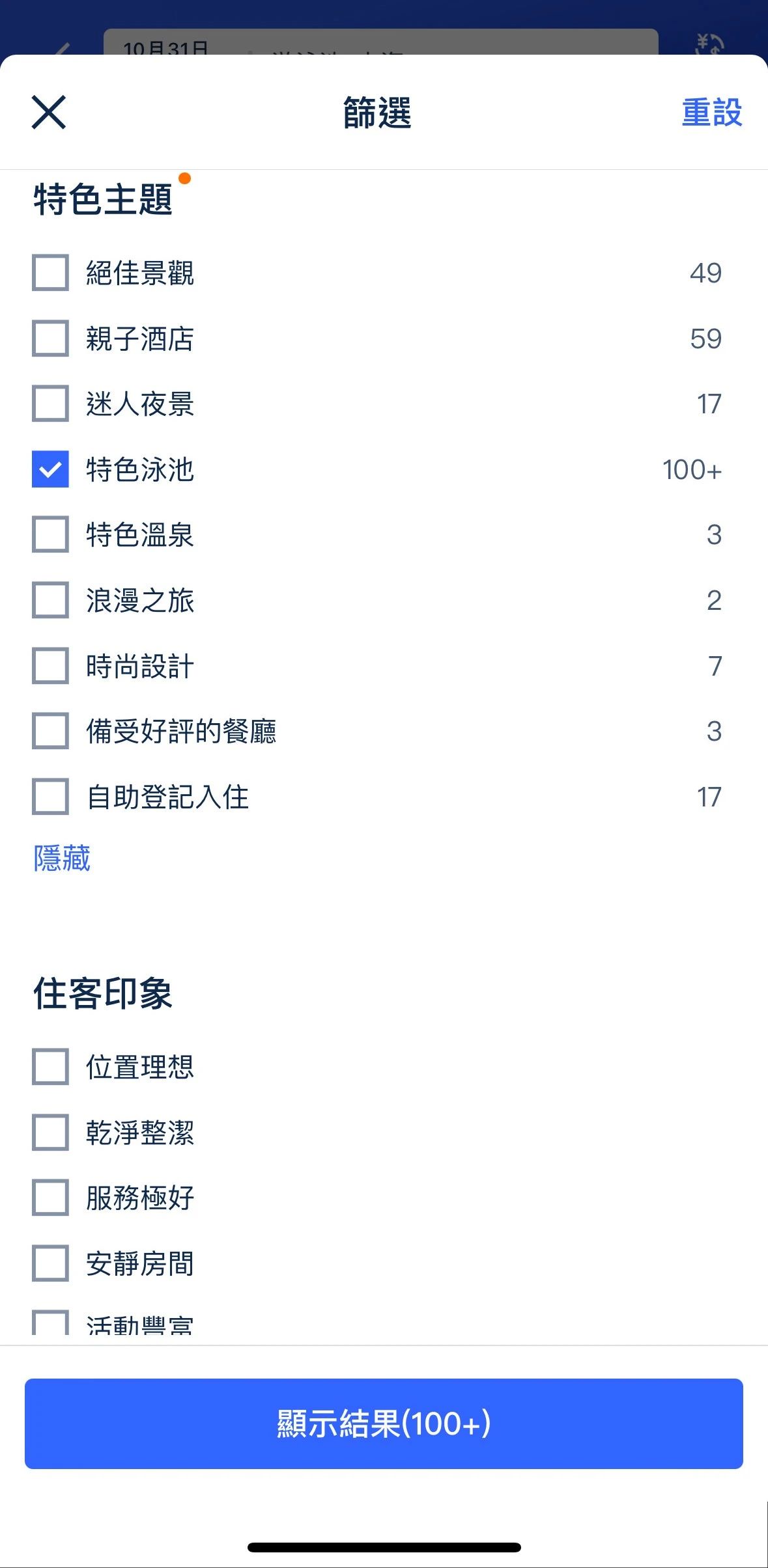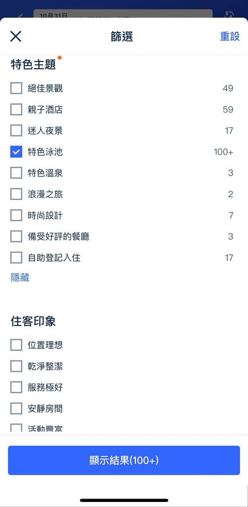此时,系统未将“热门泳池”列为热门筛选项,用户需在筛选列表中滑动五个屏幕,才能找到“特色泳池”相关筛选项(而且用户内心未必觉得完全match心中所需)。