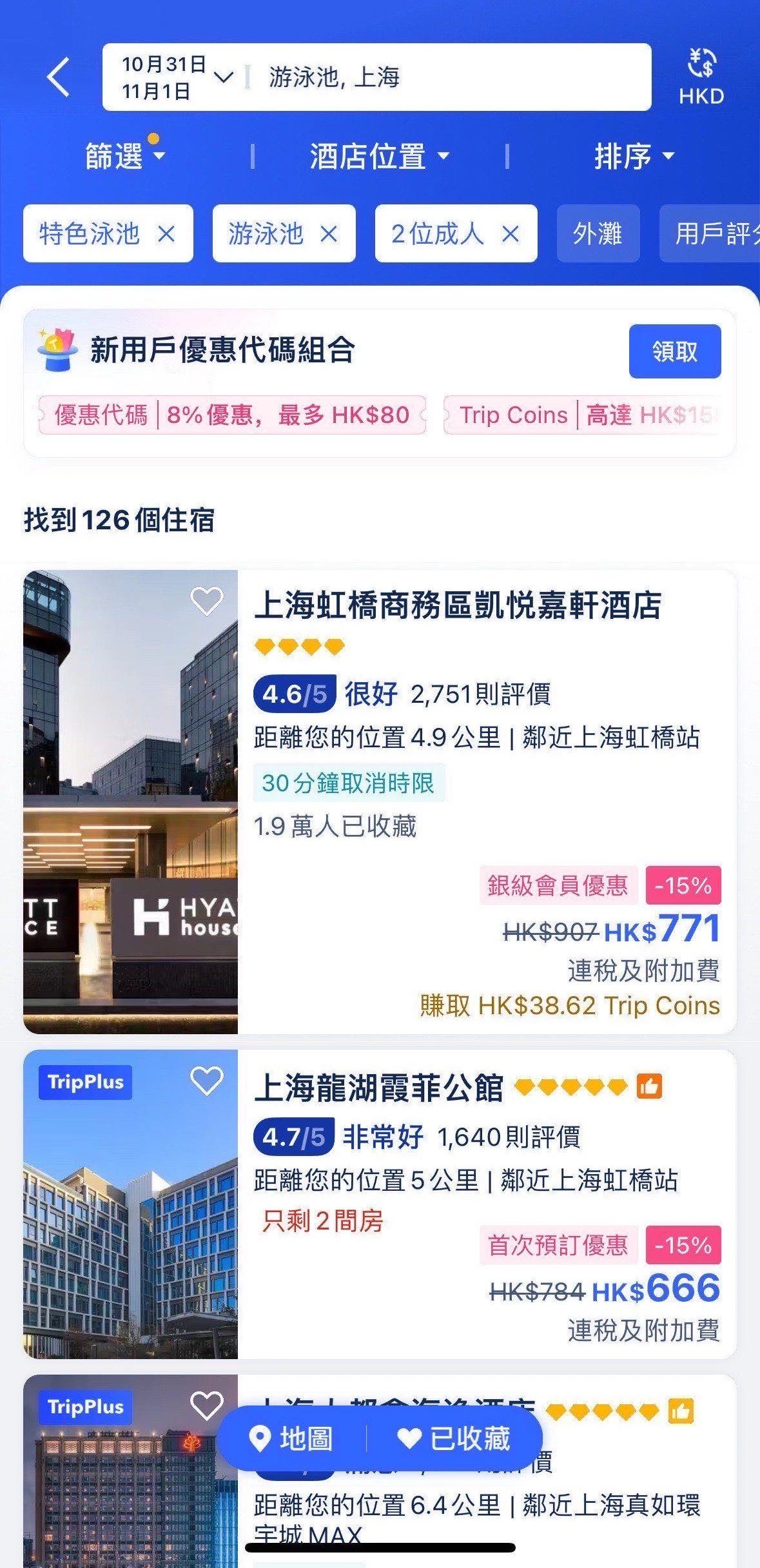 最终,用户筛选出上海特色泳池酒店列表,再次进入浏览页面查找心仪的酒店。
