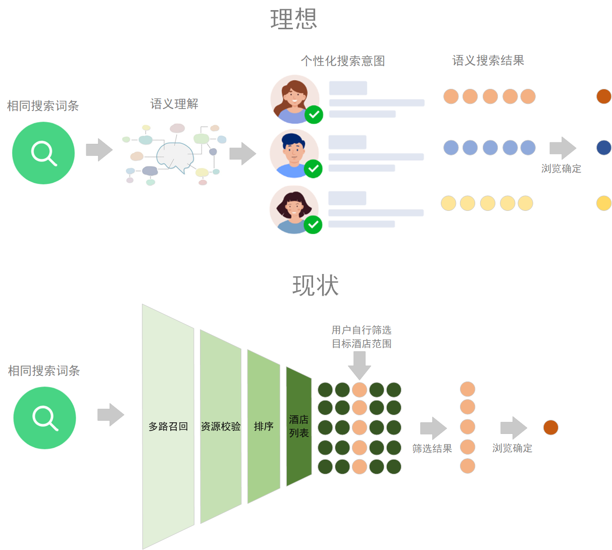 这个例子展示了一个看似简单的搜索意图背后的真实用户搜索过程。由于搜索系统缺乏语义理解能力,用户不得不降低搜索的复杂度,从“上海热门泳池酒店”简化到“上海泳池”,再通过筛选项进行自行手动筛选。在没有语义搜索的情况下,用户通过简化搜索词逻辑、扩大搜索召回结果,然后手动进行细粒度筛选来实现搜索目的。这一过程不仅耗时,而且用户体验不佳。此外,用户在搜索过程中可能会因为链路过长而失去耐心和信心,最终导致用户离开应用程序。