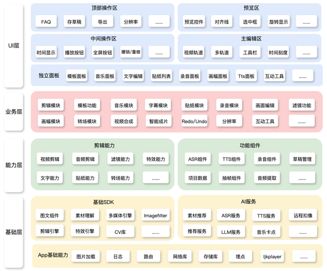 业务子模块级:按照剪辑、字幕、贴纸、音乐等不同的编辑业务进行模块拆分。