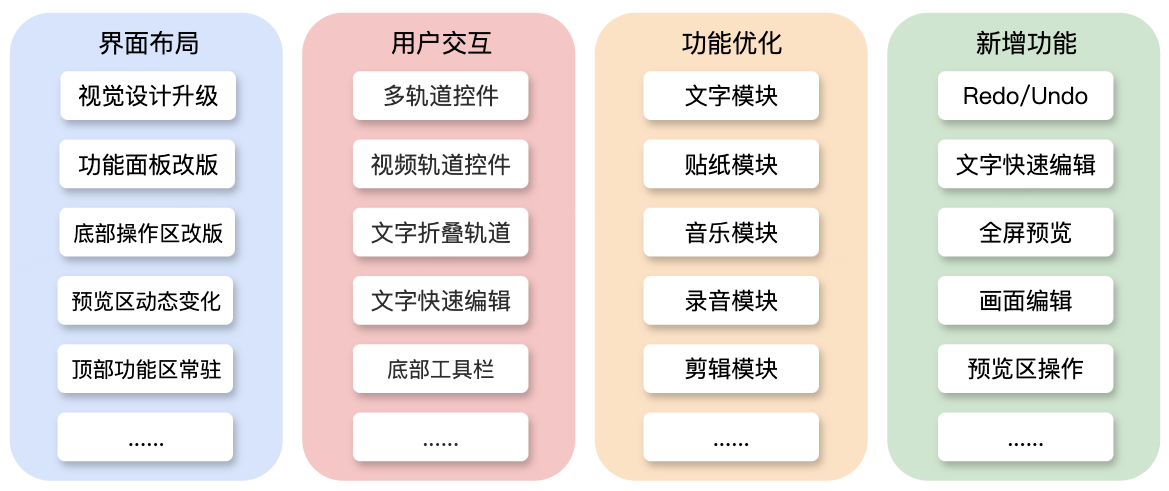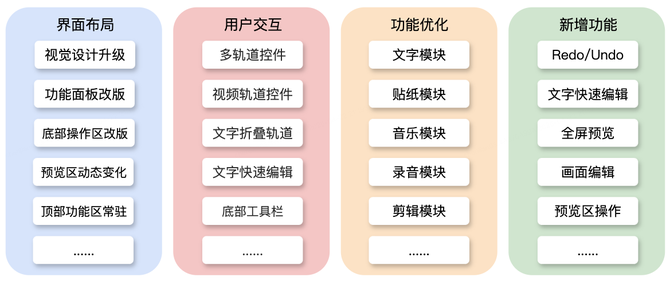 功能优化:对剪辑、文字、贴纸、转场、音乐等已有业务功能进行升级和多轨道改造。