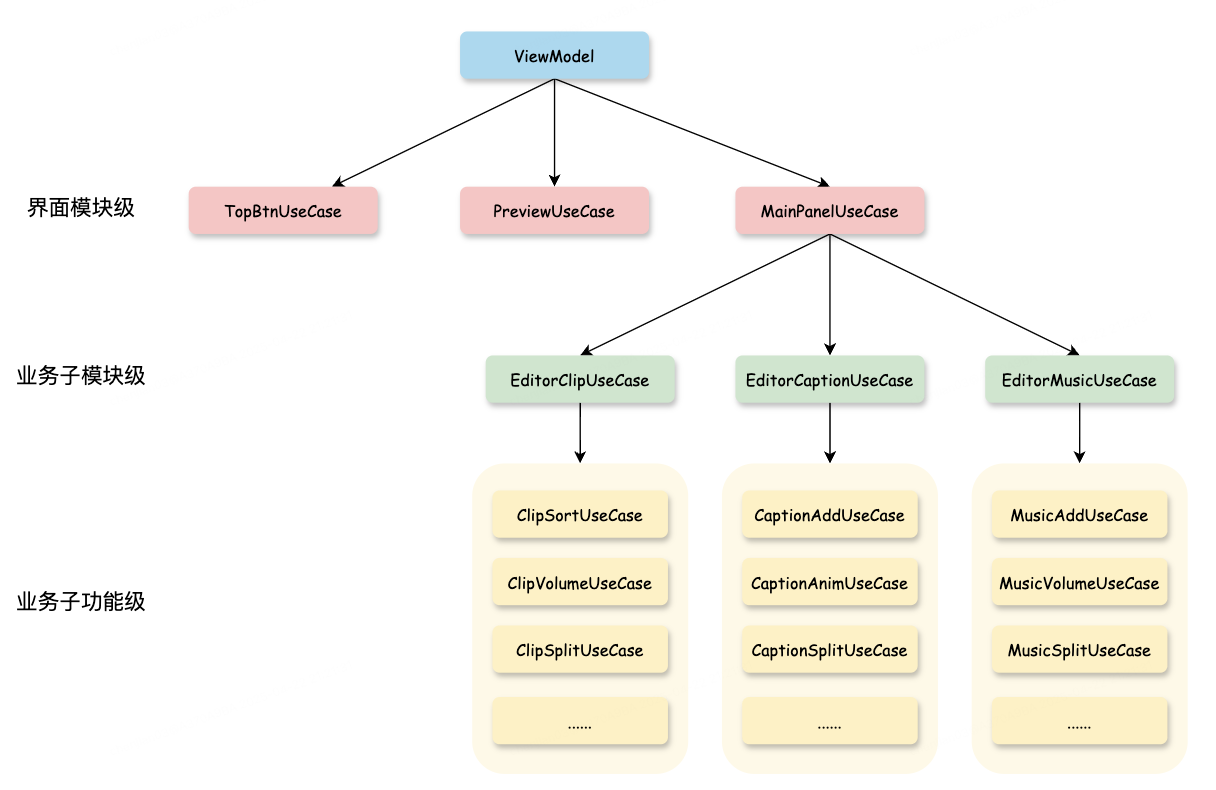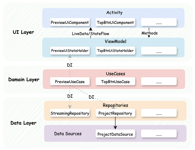 Domain Layer:网域层,在视频编辑页这样复杂度的单页面架构设计中,该层必不可少,其封装复杂的业务逻辑,使用大量的UseCase来用于处理复杂的业务逻辑并且支持业务代码的可重用性。