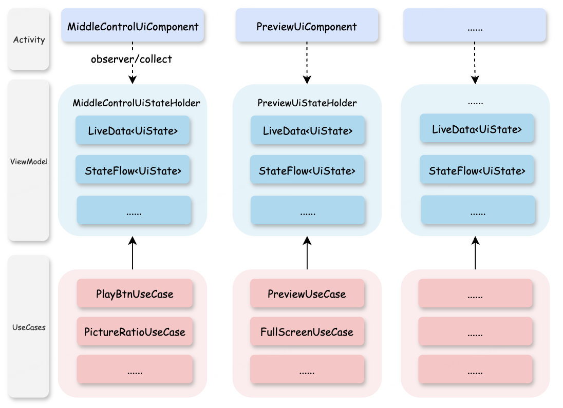 UiStateHolder:对于不同的业务模块,每个业务模块会使用一个或多个UiStateHolder来持有LiveData/StateFlow。