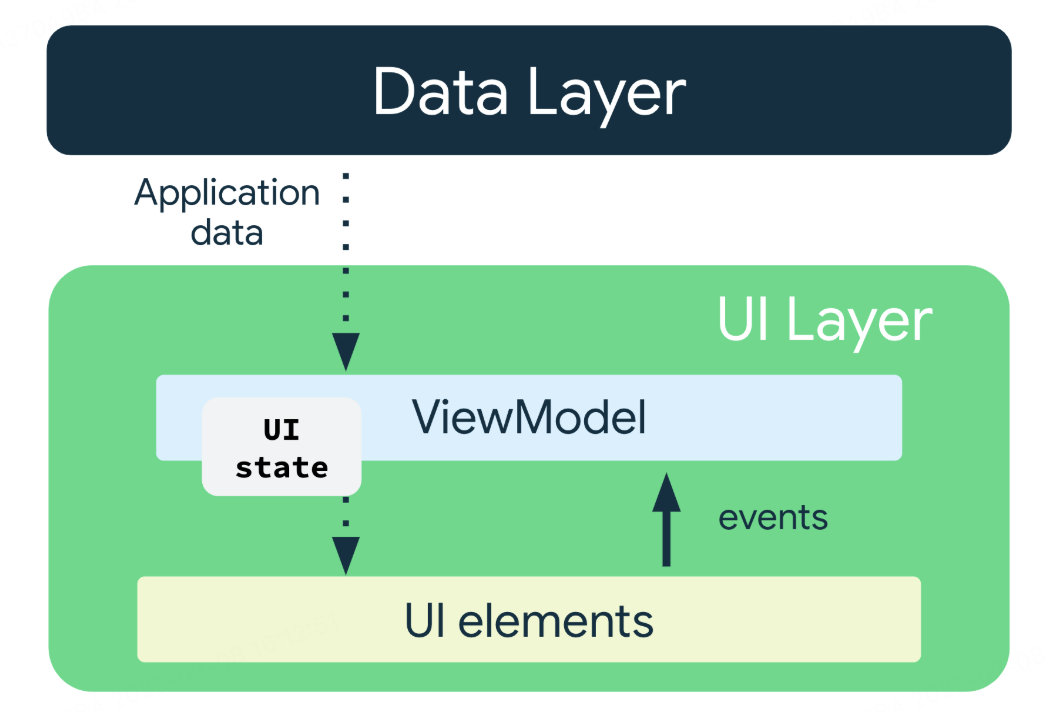 UI Layer:界面层,分为UI元素(Activity/Fragment)以及状态容器ViewModel,通过UiState(界面状态)来控制界面元素的变化。