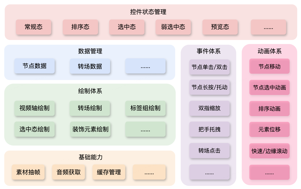 事件体系:如果是对装饰性View的操作,则直接采用对View设置监听事件的方式实现,对于自定义绘制的视频节点、转场等元素,则自定义事件的分发流程,按照元素的位置+层级来确定事件的分发优先级。