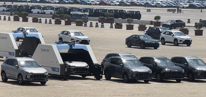 随后,笔者又来到了码头作业现场,发现吸引人眼球的当属那一辆辆有序穿梭的AT-AGV小车。这些智能搬运设备如同不知疲倦的“钢铁侠”,精准地将众多商品车进行搬运和摆放。