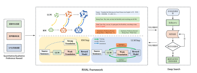 具体而言,RIVAL 框架将语音时长适配、原生翻译标准(准确性、完整性、流畅性等)以及 UP 主风格适配融入定性与定量结合的偏好奖励模型:
