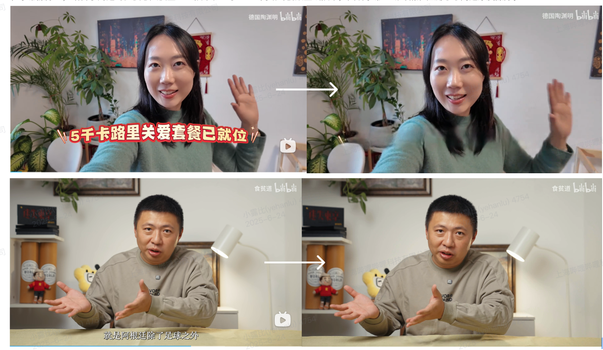 翻译后的音频与视频中人物原有的口型动作会出现不同步的现象,这种视听割裂感会极大分散观众注意力,破坏真实感和沉浸感。高度同步的口型驱动技术面临几个核心难点:一是身份的保持,在改变口型的同时,必须严格保持说话人的身份特征(ID),确保生成的下半脸看起来仍然是原人物;二是动态鲁棒性,需要处理各类复杂内容情况(e.g. 头部大角度转动、遮挡、频繁切镜)下的稳定口型生成。
