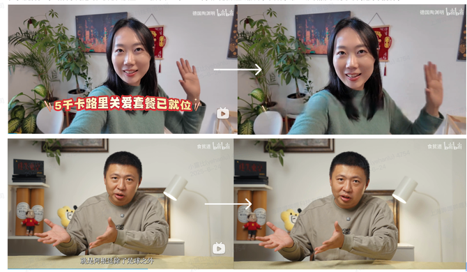 因此,我们采用Diffusion模型作为生成基座,开发了高保真、强鲁棒的口型驱动技术。在人脸编码部分,使用 3D VAE更好地捕捉视频的时序特征进行建模,显著减少了嘴唇变色、牙齿抖动的难点。同时,引入参考网络 (Reference Network) 机制,学习提取并注入原始人物面部的身份特征信息,确保生成画面严格匹配原人物特征,视觉上自然真实。此外,diffusion的基座能力在处理头部转动、遮挡等复杂场景时表现稳定,可扩展性也更强。